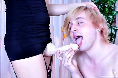 Dominative chick equipped with a huge strapon treats her guy to a butt fuck